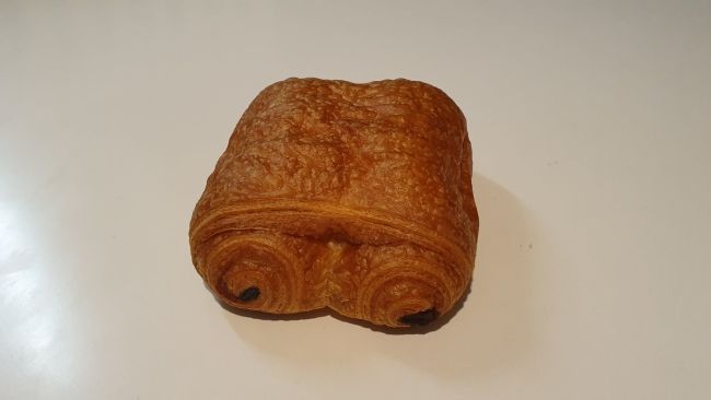 En klassisk pain au chocolat med sprøde lag og fyld af chokolade, der giver en fyldig og let sød smag.