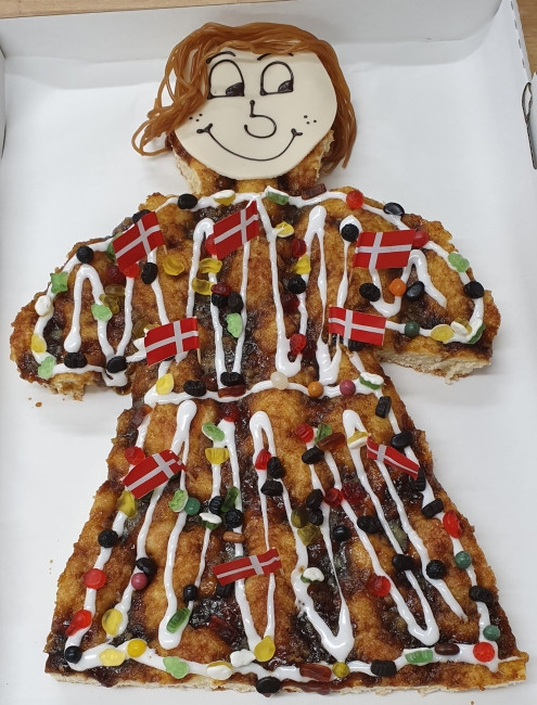 Du kan vælge mellem følgende: Vandbakkelse Brunsviger Wienerbrød Hindbærsnitte Romkugle Chokoladekage
