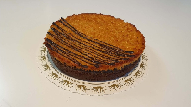 En lækker og intens chokoladekage med chokoladestykker, toppet med en sød og let sprød drømmekage-topping.