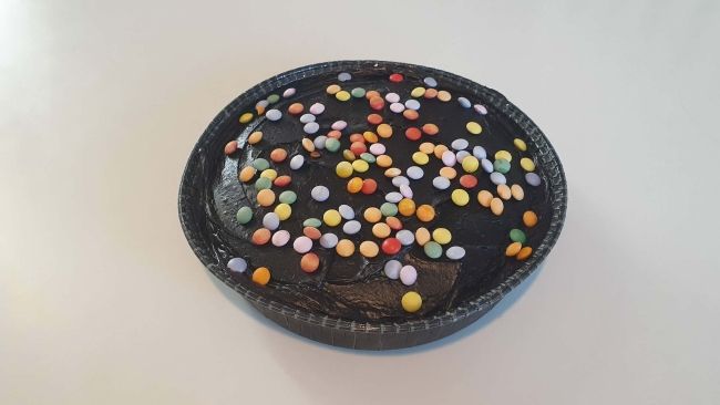 En lækker og saftig chokoladekage toppet med blød chokoladetrøffel og farverige smarties.