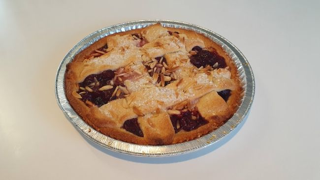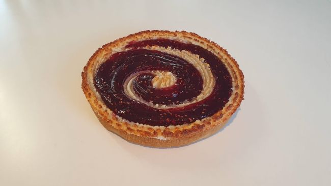 En lækker tærte med sprød linsedej og fyld af kirsebærmarmelade, som giver en frisk og frugtig smagsoplevelse med fin balance.